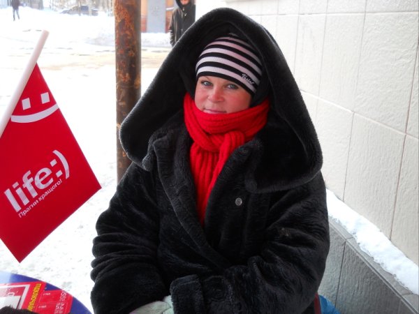 Марина, предприниматель: я оптимист, поэтому и мороз не страшен. Никуда не денешься – работать надо! Стою уже с 9 часов и собираюсь пробыть здесь, как обычно – до 15.30. Чай пока пила только утром. Главный обогреватель – хорошее настроение и улыбка! На мне шапка, капюшон, футболка, два свитера. Дополнительный обогреватель – пояс из собачей шерсти для поясницы. Куртка непродуваемая. Под варежками еще и перчатки. Брюк двое – на синтепоне, плюс колготы. Ботинки дорогие – утепленные, на один шерстяной носок.