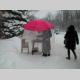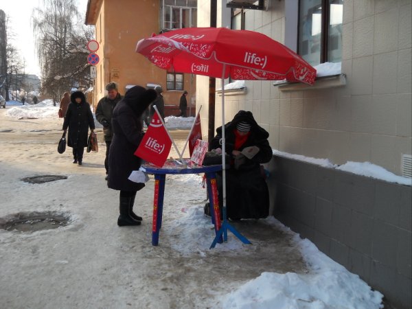 Оксана, продавец: я работаю не каждый день, у меня есть сменщик. Сегодня моя смена и, к сожалению, мороз. Выходила к 10 утра, был 21 градус. Переношу нормально, на этой точке скучать некогда – небольшое движение есть. Нам за выход на мороз доплачивают. Сколько – секрет (улыбается). Греюсь чаем. Уже выпила два стакана. Немного замерзла. На мне шапка, шуба, футболка и 4 свитера. Под утепленными брюками 2 колгот и гамаши. В зимних кроссовках 3 пары носков.