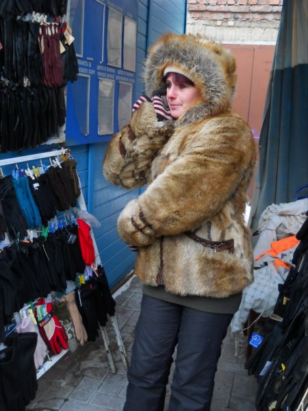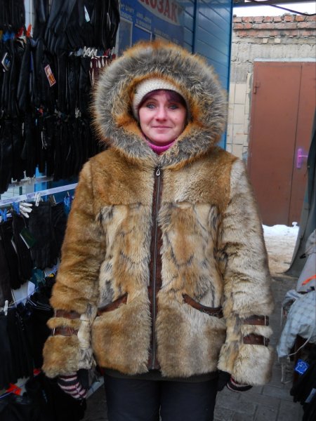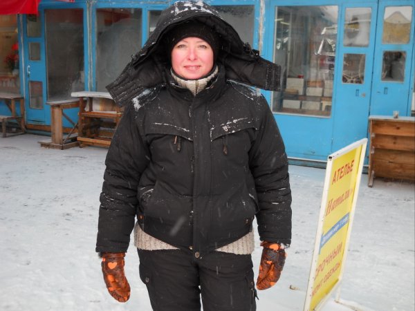 Елена, реализатор: я на работе с 8.30. Из-за мороза день у нас укороченный – до 15.30. Вышла работать только из-за материальных трудностей – надо кормить семью. Конечно, на морозе тяжело. Оделась тепло, но мерзнут руки и ноги. Для согрева стараюсь позитивно мыслить и двигаться. Плюс, чай и горячее какао. После какао минут сорок холод не чувствуется. Пол-литра горячего напитка уже выпила. У меня шапка, капюшон, футболка и два свитера. Один из них из собачьего меха. Еще меховой жилет, натуральная дубленка и сверху еще один жилет из собачьей шерсти. Утепленные брюки, колготы и гамаши. Валенки на две пары носков. Носки тоже из «собачки». К сожалению, торговля слабая.