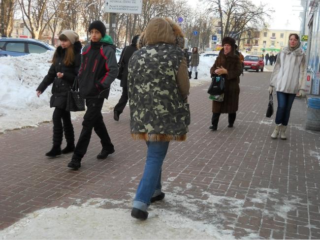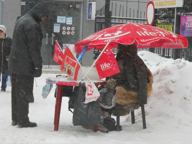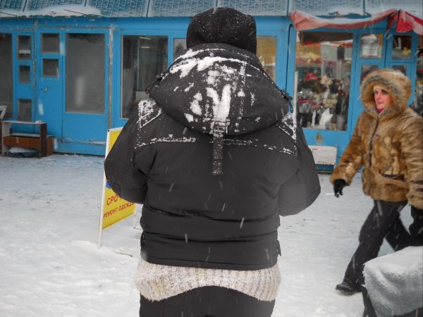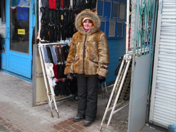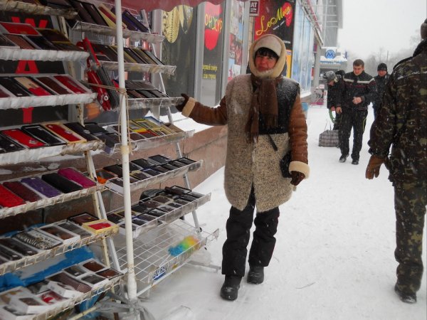 Руслана, продавец пополнения мобильных телефонов: я работаю в любую погоду. Из-за мороза сегодня работаю с 10 до 15.30-ти. Это такое послабление от начальства. За 4 года работы уже привыкла к любой погоде. Главное средство обогревания, как и у всех – чай, кофе. Покупаю напитки за свои деньги, а это дополнительные расходы. Понятно, что к выходу на работу подготовилась: шапка, пальто, шуба, двое теплых колгот, гамаши, ватные брюки и валенки на три носка. С торговлей проблема.