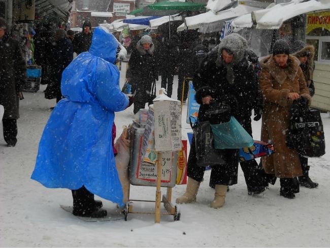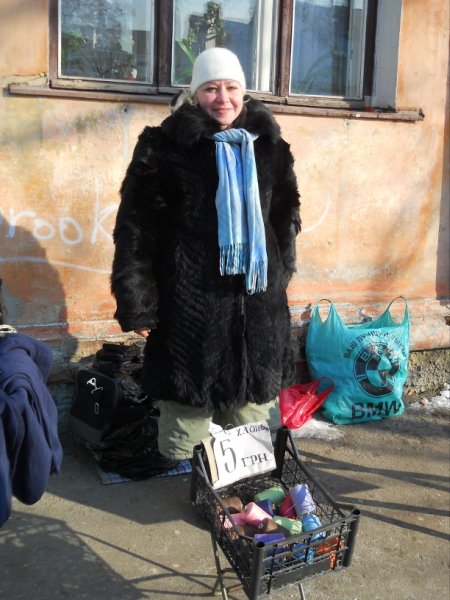 Маргарита, продавец: я вышла немного подработать. Продаю нитки. Выходила к 8 часам утра. Смотрела на градусник – было минус 24. Выходить стараюсь ежедневно, невзирая на погоду. Делать нечего – нужны деньги. Переношу мороз, как и все. Время от времени греюсь чаем или кофе, захожу погреться в магазин. Оделась сегодня мощно: куртка, комбинезон, шуба. Под ними 5 свитеров (улыбается). Жаль, в обувь не влезло еще пару носков – ноги мерзнут. Рядом стоят парни, они постоянно для согрева «накатывают» по пару капель. Знаю, что это не правильно. На морозе – только чай!