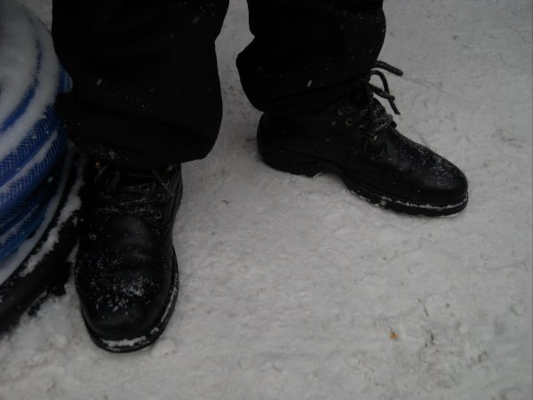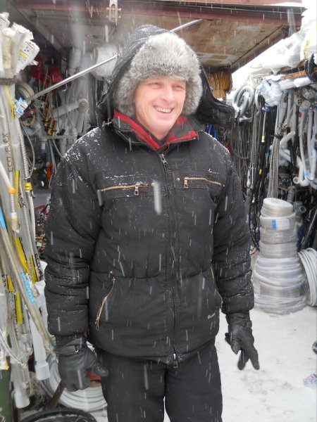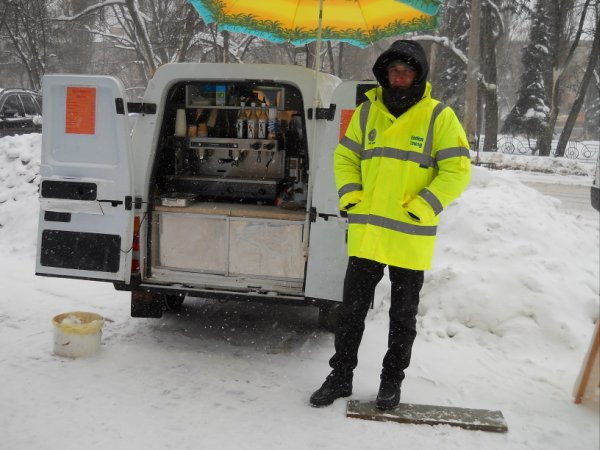 Александр, хозяин «кофемобиля»: мы работаем уже месяц. Частенько подъезжаем и к Детскому Миру. Мороз не пугает – можно погреться в машине, зайти в магазин, или попить кофе собственного производства. Невзирая на мороз, цены мы не подняли. Торговля, хоть и небольшая, но есть. Конечно, одет я тепло: футболка, свитер, реглан. На пуховик надел фирменную ветронепродуваемую куртку. Брюки обычные, а вот, ботинки зимние на два носка.
