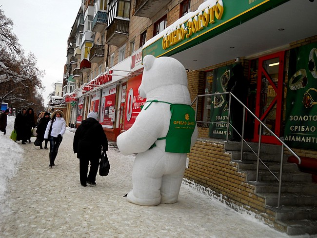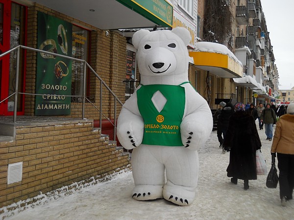 Мишка был белым, мохнатым (чуть не написал, пушистым), симпатичным и очень большим – метра два с половиной в высоту. При этом, судя по выражению «лица», совсем не злым. Северный гость с чувством собственного достоинства прохаживался возле одного из магазинов и свысока посматривал на проходящих мимо горожан.