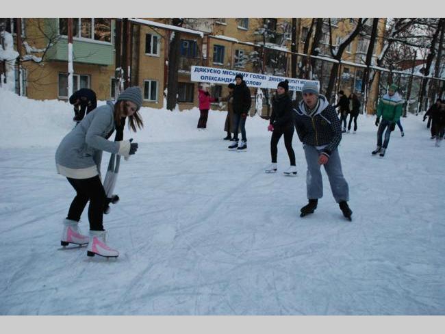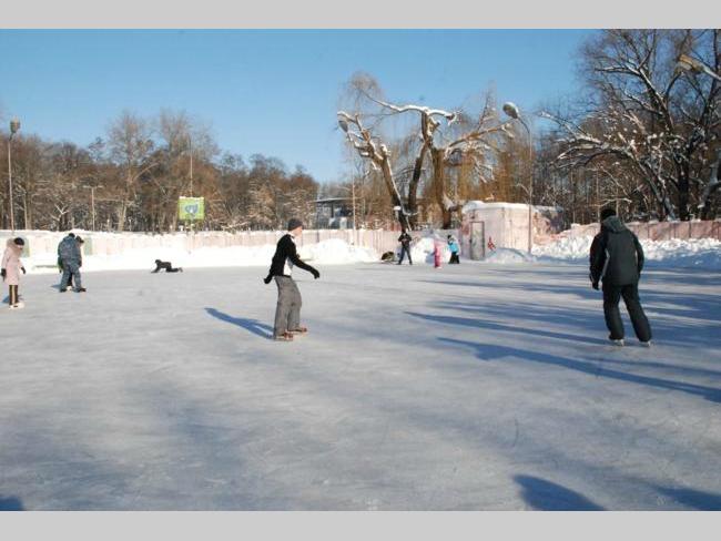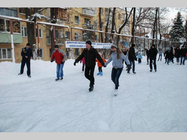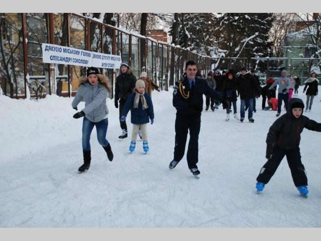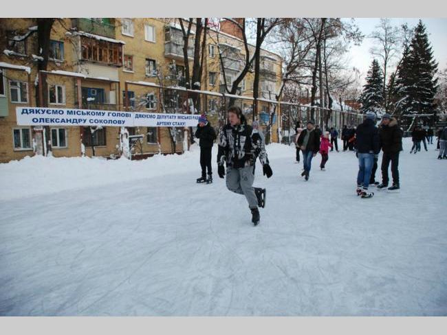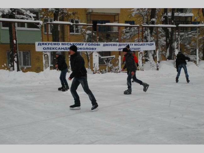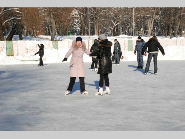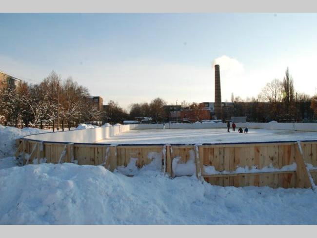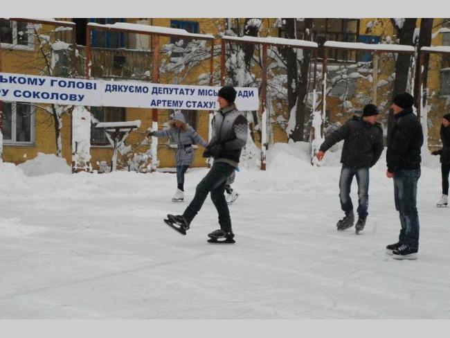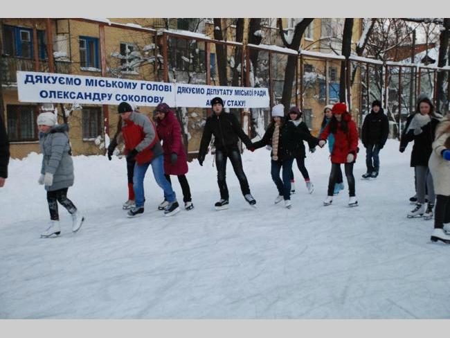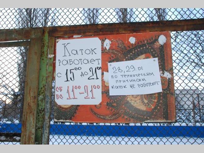 Это наиболее доступный каток, на который посетителей пускают бесплатно. Да и прокат коньков здесь самый дешевый. Радует и наличие немалого количества лавочек, на которых можно переобуться. А вот верхнюю одежду вам придется вешать на сетку площадки. Традиционно эту площадку украшают слова благодарности мэру и одному из депутатов горсовета. Правда, благодарности эти почему-то без подписей. Друг другу, что ли, спасибо говорят?