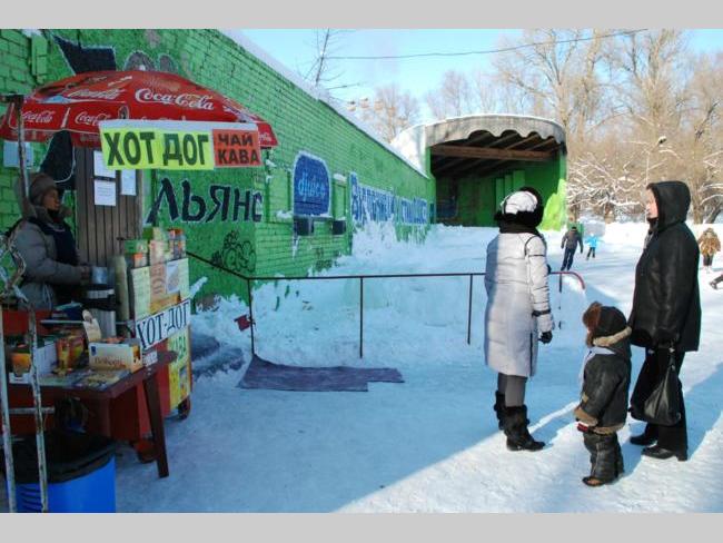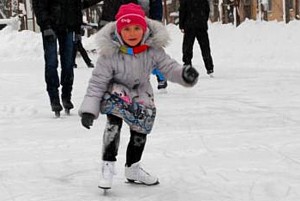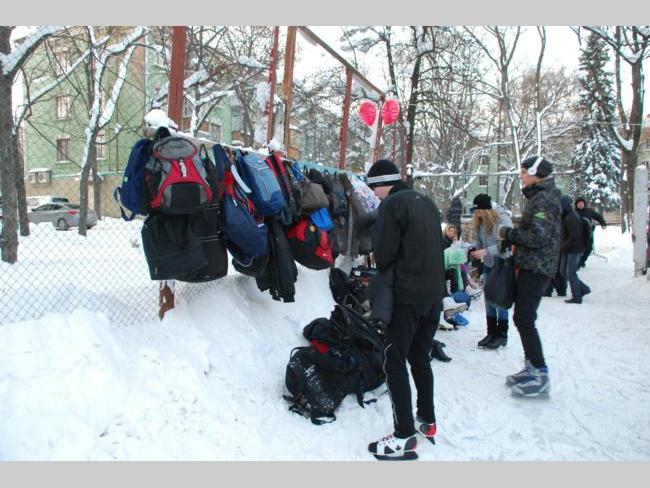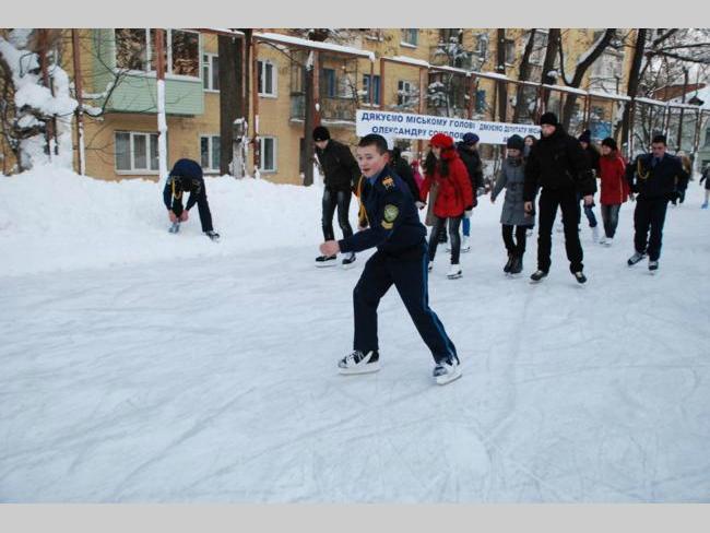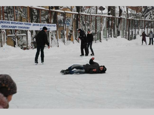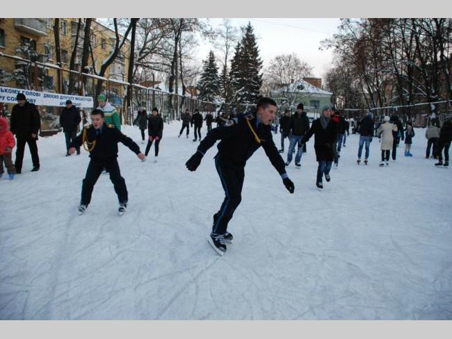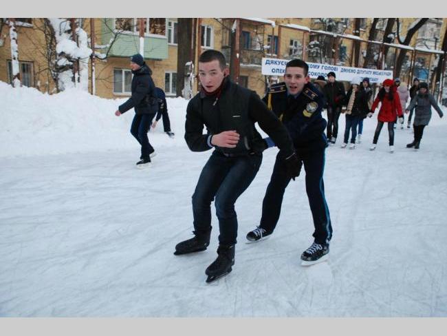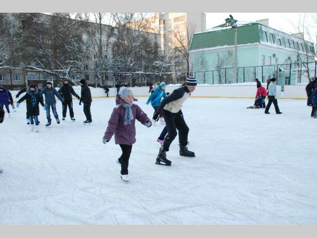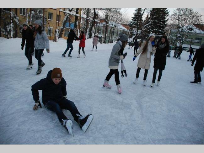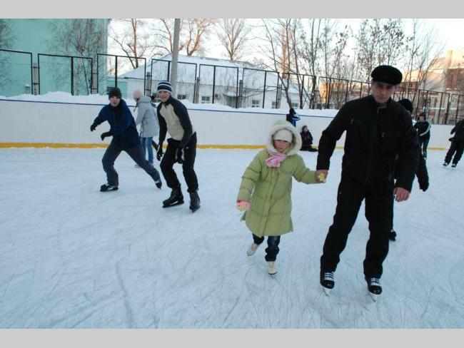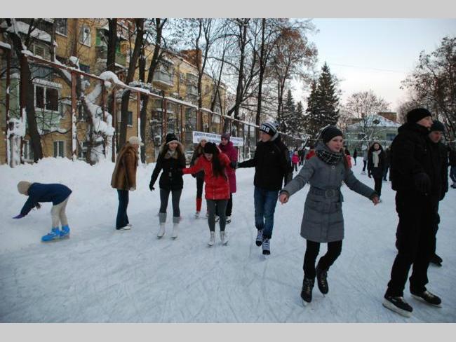 Это наиболее доступный каток, на который посетителей пускают бесплатно. Да и прокат коньков здесь самый дешевый. Радует и наличие немалого количества лавочек, на которых можно переобуться. А вот верхнюю одежду вам придется вешать на сетку площадки. Традиционно эту площадку украшают слова благодарности мэру и одному из депутатов горсовета. Правда, благодарности эти почему-то без подписей. Друг другу, что ли, спасибо говорят?