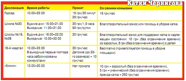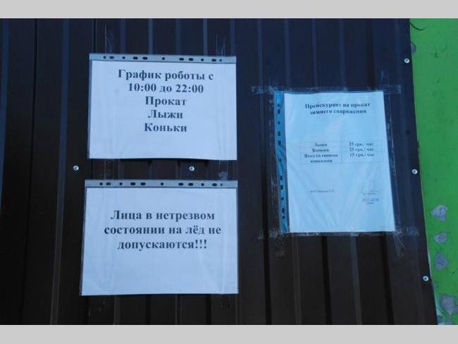 Из шести катков лишь два (горсад и школа №20) вывесили на всеобщее обозрение таблички с графиком работы (в горсаду указана ещё и стоимость услуг). Остальным же черниговцам ранним утром, например, по дороге на работу узнать о расписании будет не от кого.