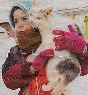 Наташа розповідає, сидячи у кріслі, а Христинка в неї за спиною ховається. Засоромилась, що в хату зайшли двоє чужих, один ще й фотографує. Дівчинка гарненька: веселі оченята, як смородинки, густе волосся, струнка. На щоках рум'янець. Тільки кісок нема. «У школу хтось приніс воші, так довелося і нам коси одрізати», — пояснює Наташа.