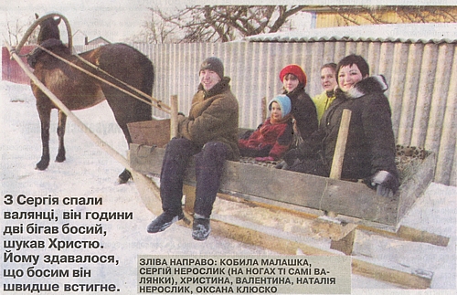— Так от, 4 грудня дід Володя каже: «Одвезеш мене на станцію на коняці? Хочу на возі прокататися». Сергій каже: «Одвезу». Станція «Ніфар» поблизу Ніжина, — продовжує Наташа. — Я й собі збираюся. Полінка тоді лежала в лікарні з тяжким бронхітом. Валя біля неї сиділа вдень, я вночі. Думаю, поїду з ними, проведу діда, потім підміню Валю в лікарні. Були ми такою ж компанією, як сьогодні. Повечеряли, пляшку розпили і поїхали. Сергій та Оксана з нами. У нас коняка вредна, «кермував» Сергій. Ось ми вже на «Ніфарі». До електрички ще був час. Дорослі посходили з воза, Христина залишилась. Дід каже: «Знімайте сумки». І пішов до рейок. Я бачу, наближається електричка. Ще не наша, але дід через колію перейти не встигне. 67 років, як-не-як. Я за нього, не пускаю. Втримала. Електричка проїхала, як засвистить! Машиніст побачив, що люди близько біля рейок, вирішив застерегти. Електричка засвистала, кобила смикнулась. Кричу: «Серьожа, тримай кобилу!» Та вона стрибнула і його за собою потягла.