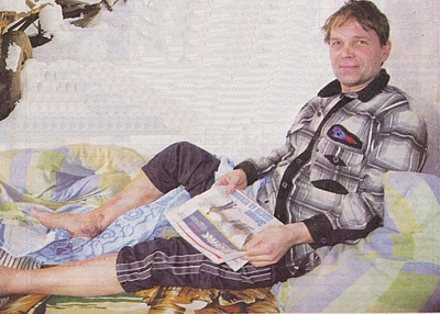 — Нормально. Ходити б скоріше. Оце Алла (дружина) пробувала мене на милиці ставити, так ноги наче ватяні, ніяк не слухаються. Відразу приток крові донизу, ноги синіють, набрякають. Кров «пробиває» шкіру і тече... У мене ж ноги різані-пере-різані, місця живого немає. Багато переломів було. П'ять операцій переніс. Шосту, сказали, робитимуть через рік. У мене металева пластина в лівій нозі. Он, дивіться, навіть вигинається — показує Іван Гнідий. — На титанову грошей немає, взяли просту, недорогу.