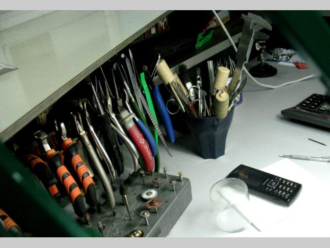 - Немного похоже на уроки труда в школе: прежде всего, это крепкий стол с деревянными подставками, наборы молотков, различные пассатижи, набор надфилей, щипцы, пинцеты, напильники, тиски, ригели (для механической растяжки колец), штихели (для вырезания простых орнаментов, монограмм и шрифтов), штангенциркуль и даже бормашина.