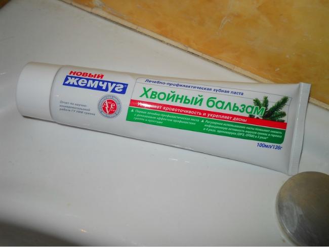 «Новый Жемчуг Хвойный бальзам» первая лечебно-профилактическая зубная паста для комплексного ухода за зубами и деснами с доказанным эффектом профилактики простуды и гриппа. Подходит для всей семьи, включая детей с 3 лет. Эффективно очищает, обладает антисептическим действием, способствует заживлению ранок и уменьшению воспалительных процессов в полости рта. Является необходимым средством для борьбы с простудными заболеваниями в период повышенной вирусной активности (осень-весна). Паста не содержит фтор, обладает характерным хвойным вкусом и придает свежесть дыханию.