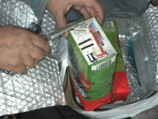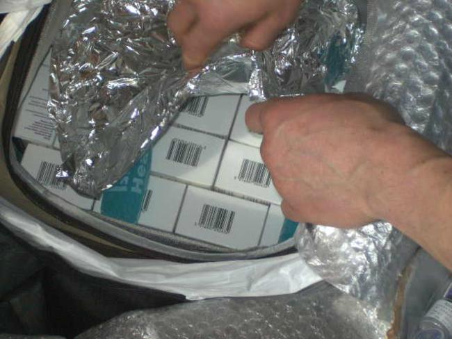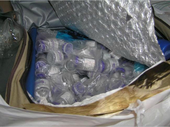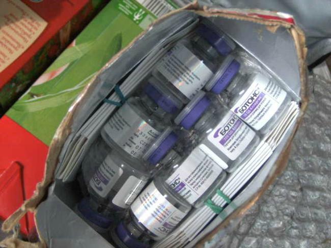 Препараты «Ботокс» находились в сумке-холодильнике под продуктами питания и аккумуляторы холода. Часть флаконов с порошком для инъекций находилась внутри 3-х пакетов из-под сока, а остальные под ними на дне сумки. Дно двухлитровых пакетов из-под сока было сначала отрезано, а потом заклеено клейкой лентой.