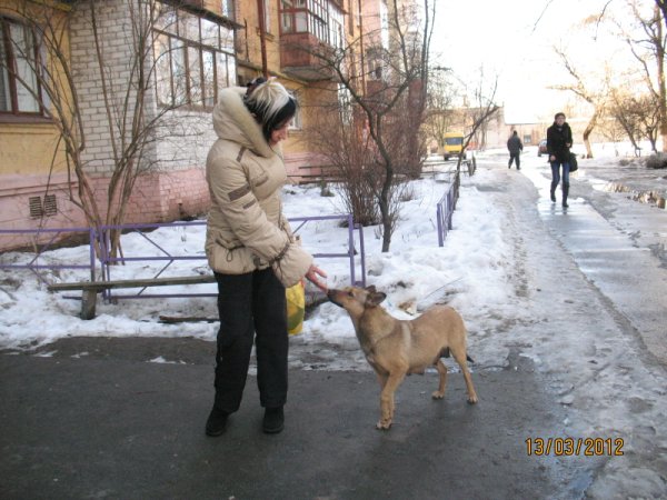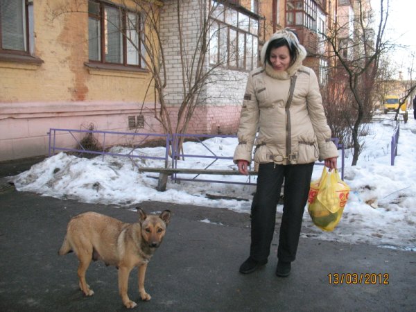 Рыжая собачка нашлась сразу, она стояла у подъезда дома. На вид – совсем безобидное животное, худощавая кормящая мама щенков. Немного испугавшись постороннего человека, собака подбежала к женщине.