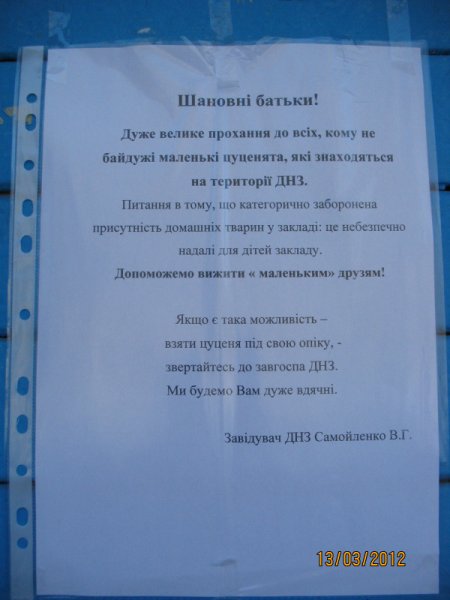 Во время этого разговора Джесси спокойно побежала во двор детского сада к своим малышам. У его ворот и на входе в помещение висит обращение заведующей к родителям с просьбой пристроить маленьких щенков. Естественно, пока они маленькие и не разгуливают по территории садика – опасности для детей не представляют, но вскоре им придется покинуть свой дом. Где будет их новый дом и будет ли он вообще – неизвестно. Если бездомную Джесси жители района полюбили, то черную собаку – наоборот.
