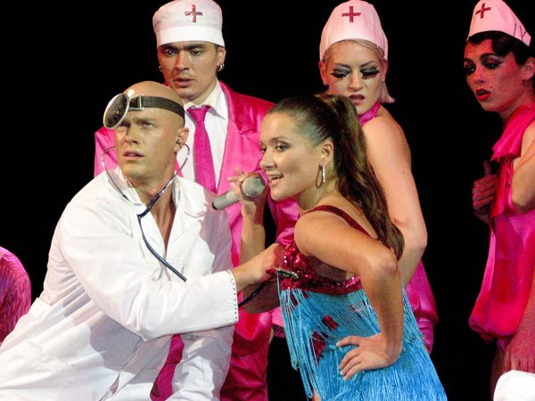Выступление открылось ремиксом на песню «Этот танец». Наташа вышла в серебристом брючном костюме с открытой спиной, босоножки в тон, а на голове украшение с серебристой звездочкой. Парни из подтанцовки даже наклеили фольгу на передние зубы.