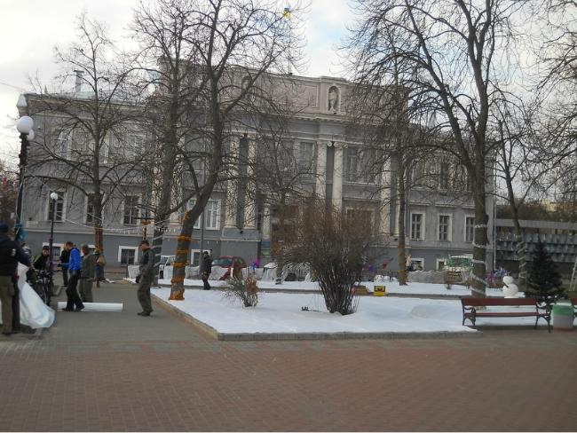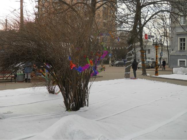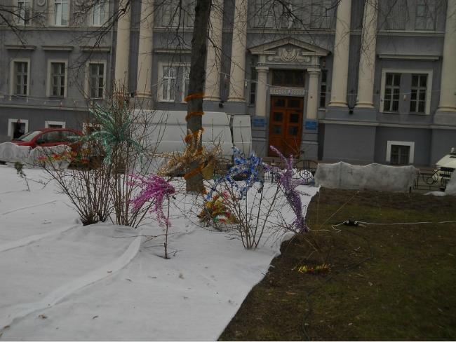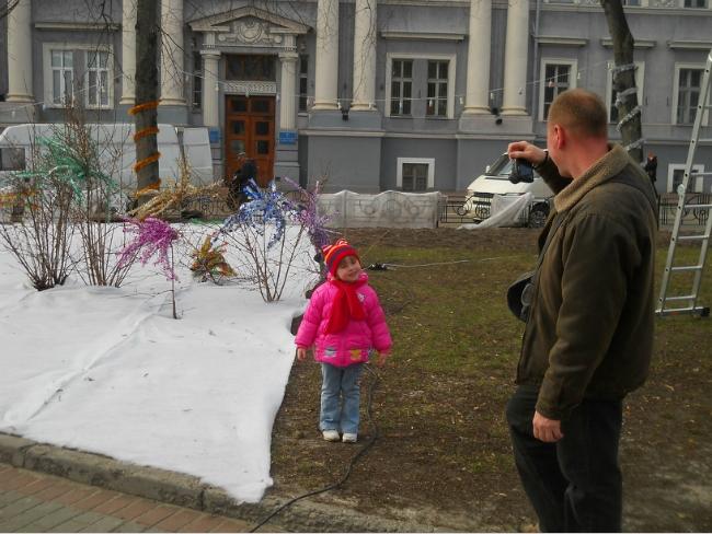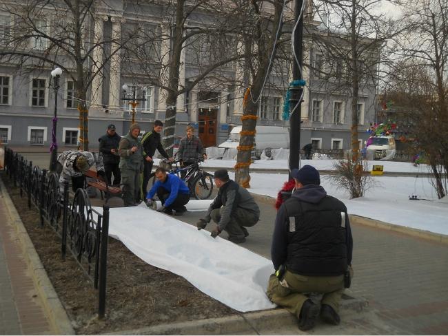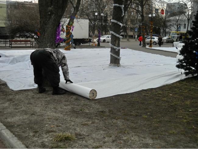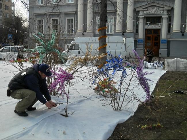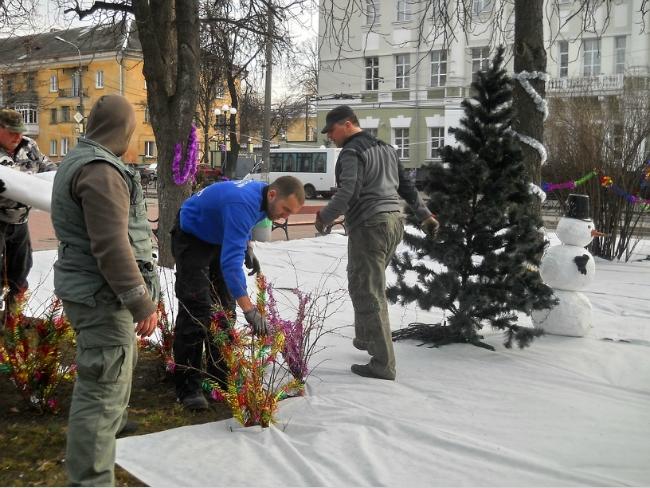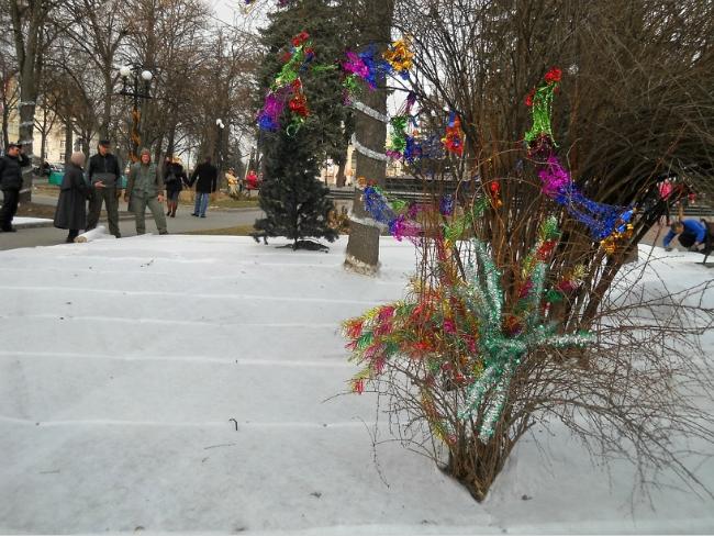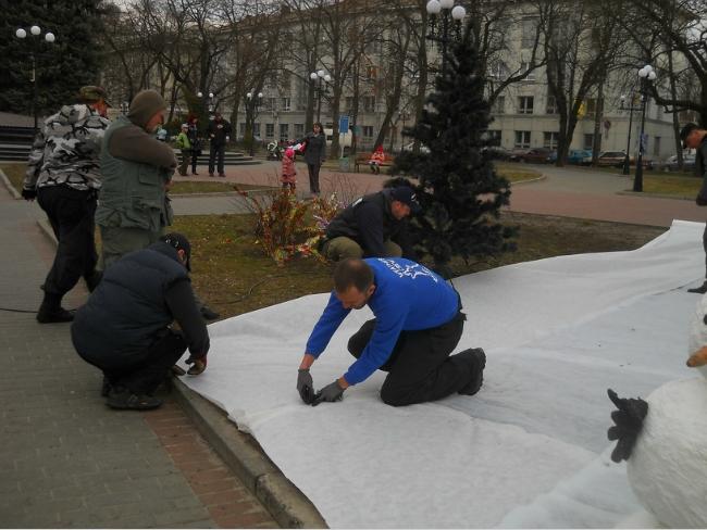 Случайные прохожие с удивлением наблюдали, как зеленый газон «светомузыкального » скверика возле горсовета постепенно становится предновогодним зимним садом.