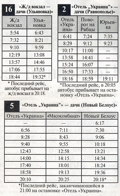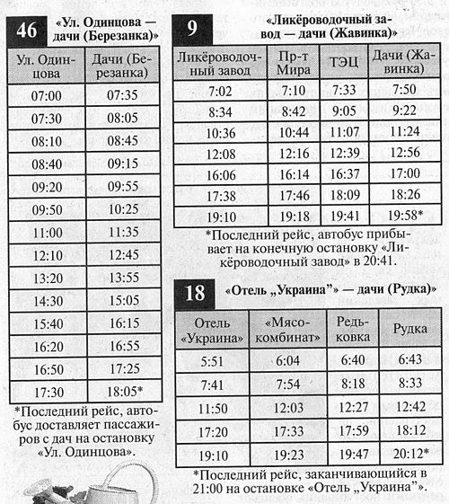 Как нам сообщили в транспортном управлении, расписание дачных маршрутов со временем может изменяться в зависимости от пожеланий пассажиров. Все вопросы по ; расписанию можно уточнить у диспетчера Светланы Щербины в будние дни по номеру 676-808 с 7:00 до 17:00 (перерыв — с 11:00 до 14:00, суббота, воскресенье — выходные). Наш совет: будьте настойчивы — звонков у Светланы Альбиновны много, поэтому наберитесь терпения и набирайте номер, пока не получите ответ.