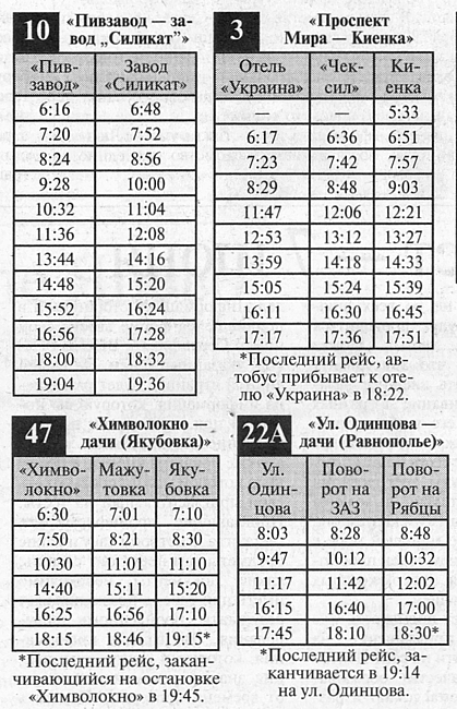 Каждый год с середины апреля начинаются массовые поездки горожан на дачные участки. Длится этот «сезон-пик» почти полгода, поэтому разработка маршрутов, обеспечение населения достаточным количеством транспорта и составление расписания движения автобусов требуют тщательной подготовки и оперативного решения. Специалисты управления транспорта и связи горсовета поработали над тем, чтобы все желающие регулярно доставлялись по 10 основным дачным направлениям. Большинство удалённых огородов горожан (а их немало, всего 26 932 участка) расположены в городской черте или в непосредственной близости от города: в Равнополье, Березанке, Жавинке, Киенке и др.