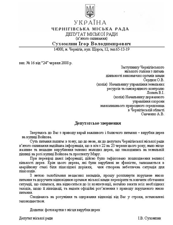 Депутат міської ради Ігор Сухомлин вже надіслав депутатське звернення на ім’я заступника Чернігівського міського голови з питань діяльності виконавчих органів влади Олександра Сердюка, начальника управління земельних ресурсів та самоврядного контролю Василя Лопати і начальника державного управління охорони навколишнього природного середовища в Чернігівській області Анатолія Савченка з проханням вивчити обставини ситуації, що склалася і надати офіційні роз’яснення з приводу інциденту.