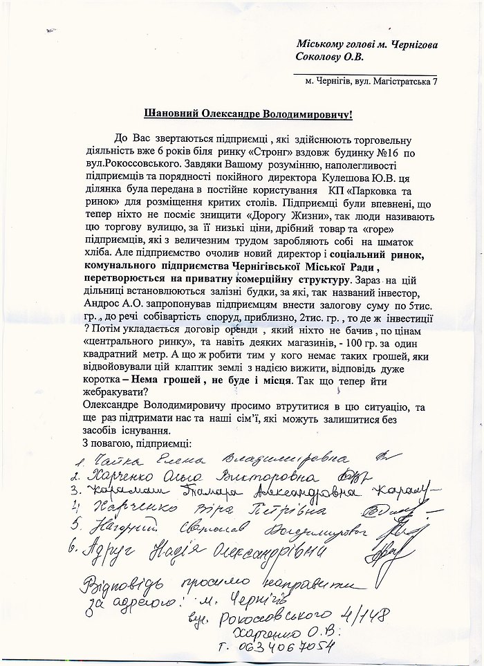 Утром во вторник, 12 июня небольшая группа предпринимателей и 2 представителя профсоюзов собрались под стенами Черниговского горсовета. Вопрос, который привёл их сюда это реконструкция рынка на так называемой «дороге жизни» возле рынка «Нива».