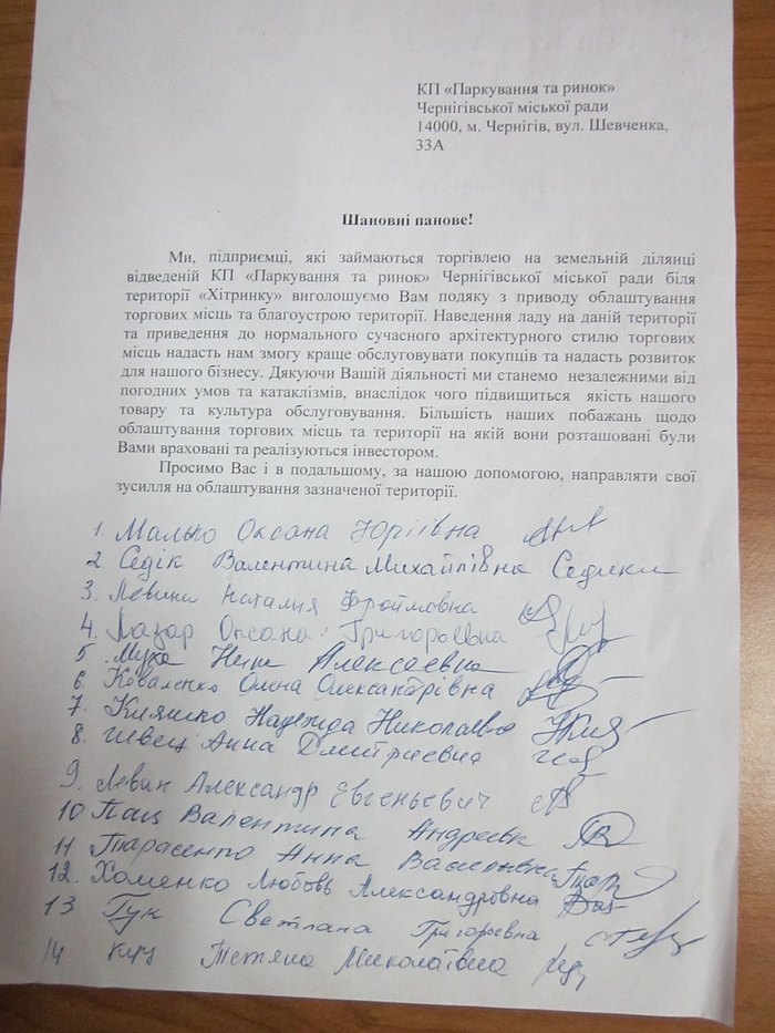Предприниматели обратились к мэру Чернигова, в Прокуратуры города и области, и депутатам городского совета с просьбой разобраться в поднимаемой ими проблеме. Требования которые выдвигают предприниматели и условия, на которых они готовы там работать – это отмена первоначального взноса и уменьшение арендной платы до 60 грн. за кв.м.