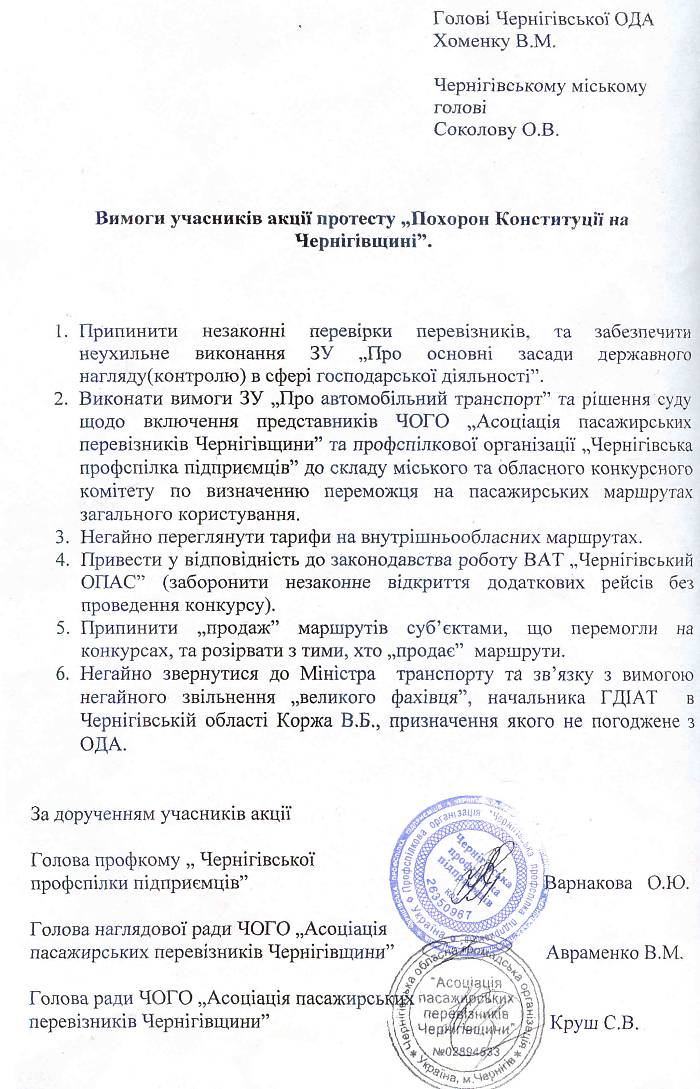Вимоги учасників акції протесту "Похорон Конституції на Чернігівщині"