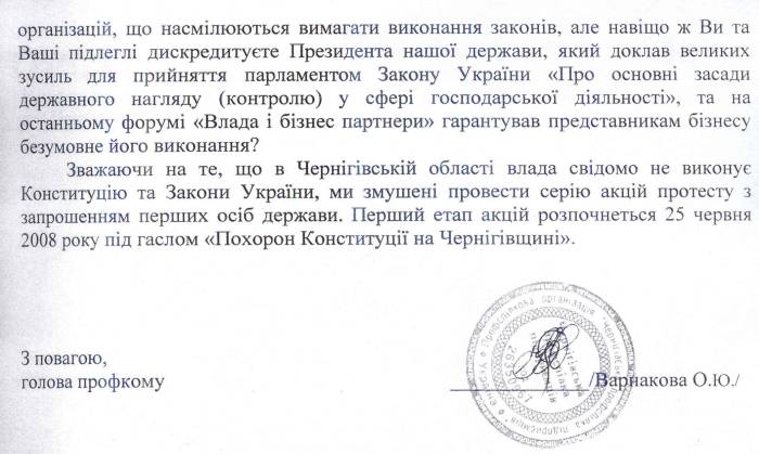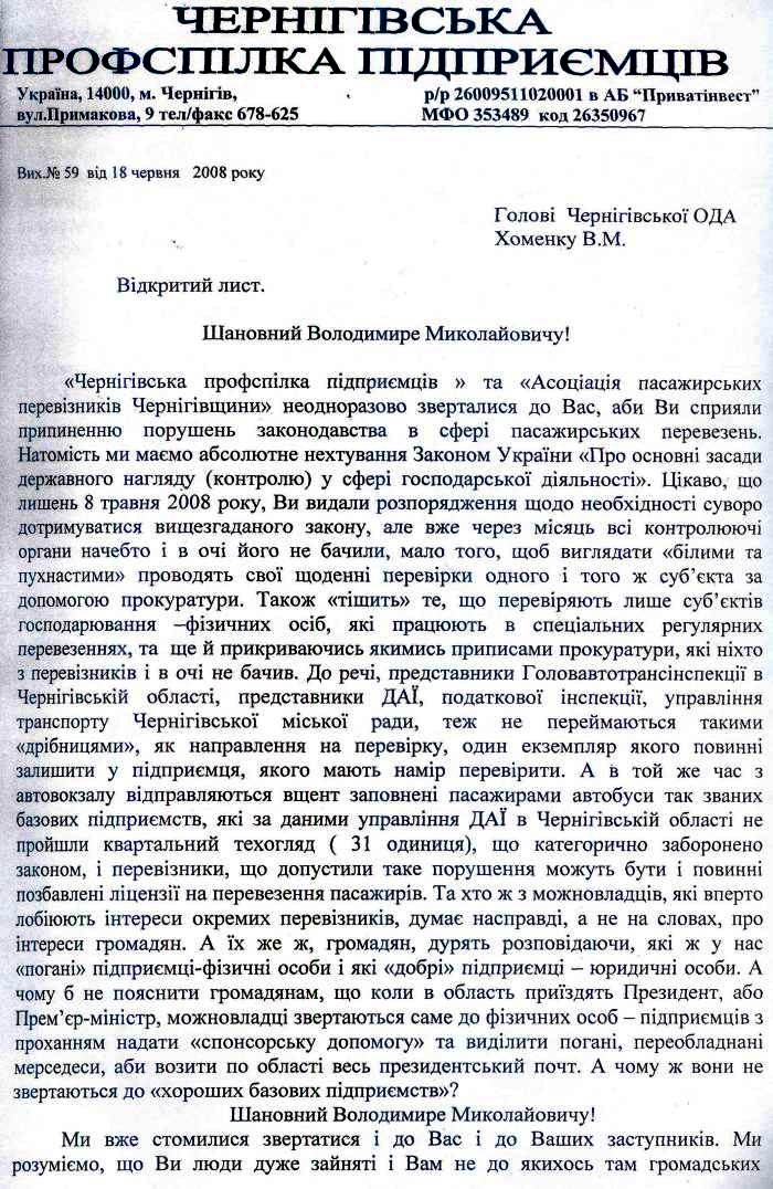Лист голові Чернігівської ОДА