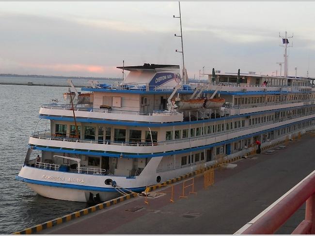 Подошли к стоящему на причале теплоходу «Принцесса Днепра». Класс судна – «река-море». 4 этажа (палубы), 280 пассажиров и 120 членов экипажа.