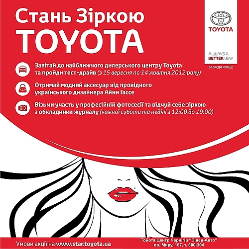 З 15 вересня по 14 жовтня 2012 року треба завітати до Toyota Центр Чернігів «Сівер-Авто», по пр-ту Миру, 167 та пройти тест-драйв. Після проходження тест-драйву прихильниця бренду Toyota гарантовано отримає модний аксесуар від провідного українського дизайнеру — Айни Гассе, а саме сучасну сумку для шоппінгу. Також всі пані, які пройшли тест-драйв під час дії акції, запрошуються на зіркову фотосесію аби відчути себе справжньою зіркою з обкладинки журналу. Зіркові фотосесії проходитимуть в автосалоні кожної суботи та неділі з 15 вересня по 14 жовтня 2012 року з 12:00 до 19:00. За згодою учасниць акції, фотографії з зіркових фотосесій будуть опубліковані на спеціальній сторінці акції www.star.toyota.ua.