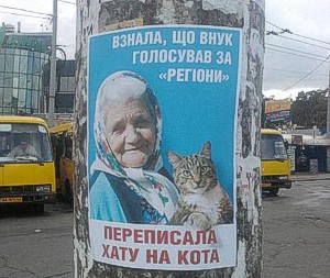 В ночь с 16 на 17 сентября на упице Рокоссовского наряд ППС (патрульно-постовой службы) поймал 19-лет- него Юрия Осипца. Он клеил на столбы листовки: «Взнала, що внук голосував за «Регіони», — переписала хату на кота», «Голосуй за Сашка — «Тойоту» перепишуть на кота». Милиционеры забрали у него 27 листовок, две бутылочки клея ПВА и составили административный протокол по статье 152 (нарушение правил благоустройства). Теперь юноше придется заплатить штраф от 20 до 80 необлагаемых минимумов доходов граждан (один минимум — 17 гривен), выходит — от 340 до 1360 гривен. (Насколько я знаю черниговские расценки, за работу расклейщика платят 100 гривен за день).