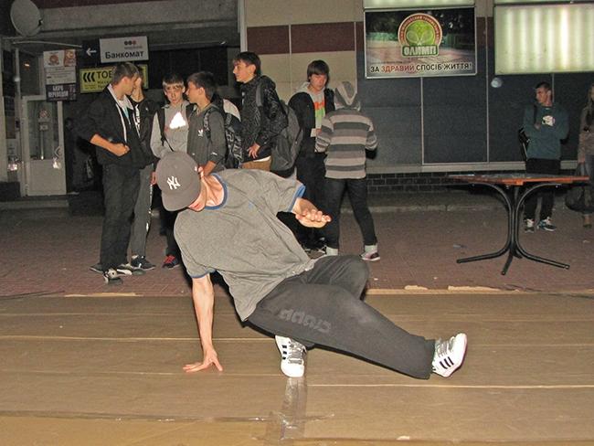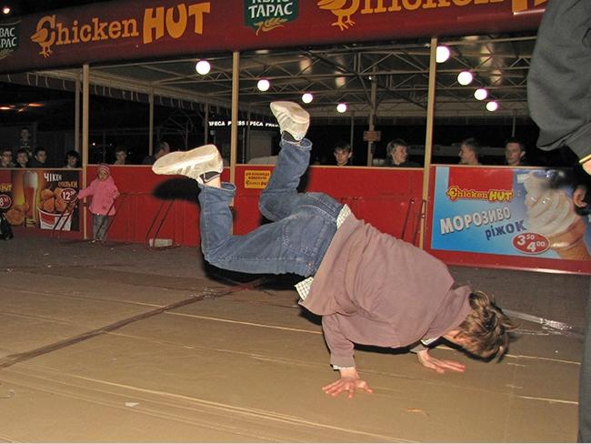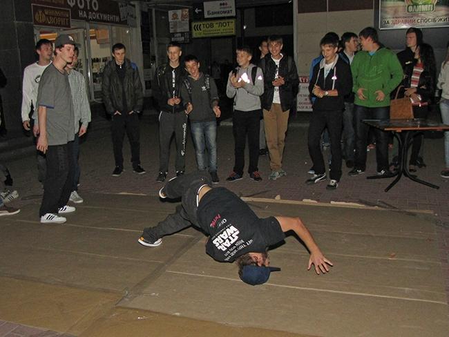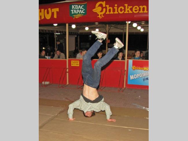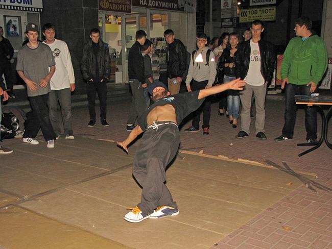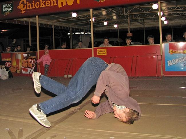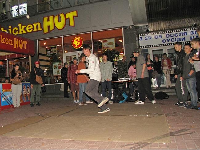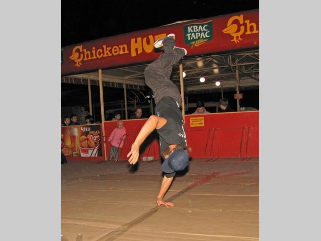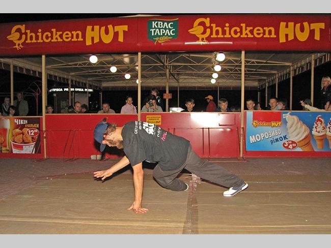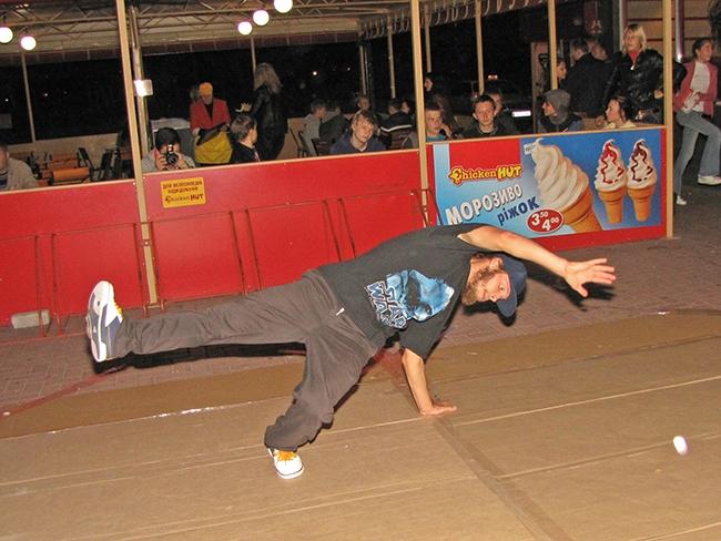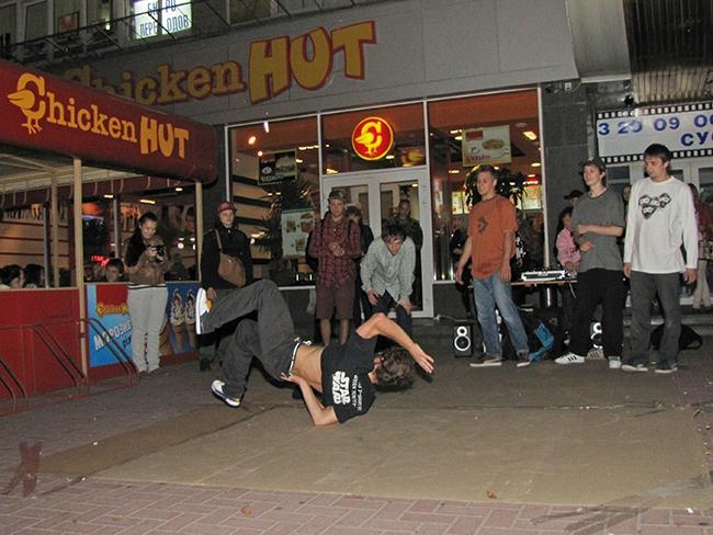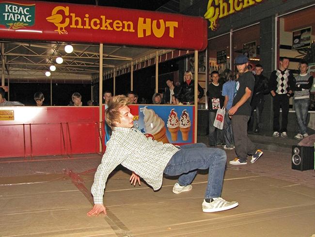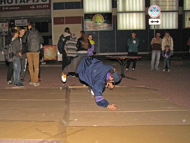 День города ребята из школы «Славь-Ян-Инь» (есть такая в Чернигове школа по Брейкингу, находится в школе № 13) отметили по Нью-Йоркски. Когда уже вечерело, они прикрепили скотчем к тротуарной плитке упаковочный картон, рядом с рестораном «Чикен Хат», и на такой импровизированной площадке устроили настоящее танцевальное шоу в ритме Хип-Хоп! Ребята демонстрировали свое умение в танце Брейк-данс (breakdance).