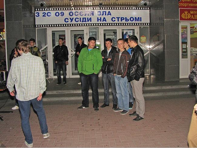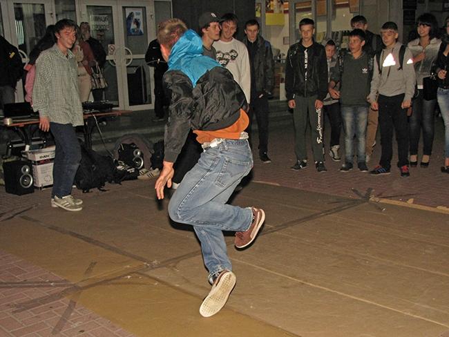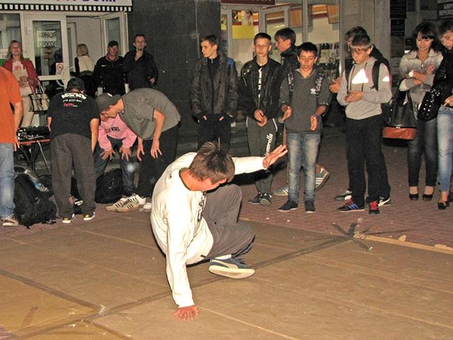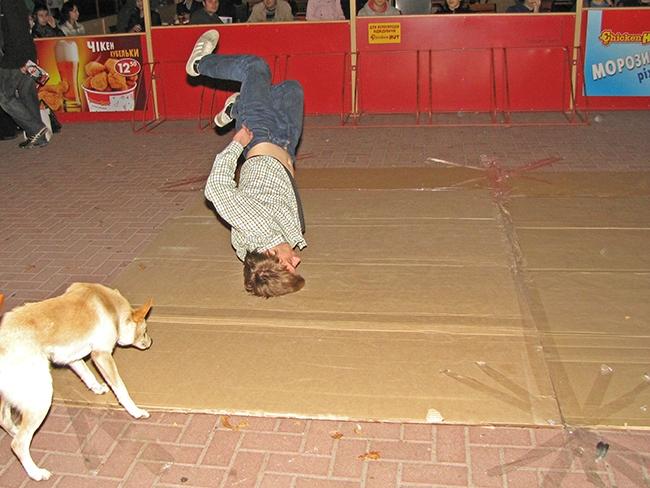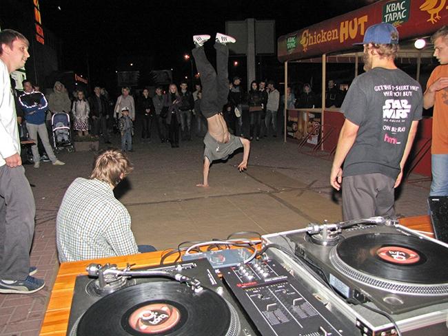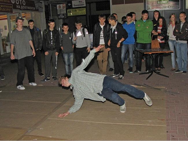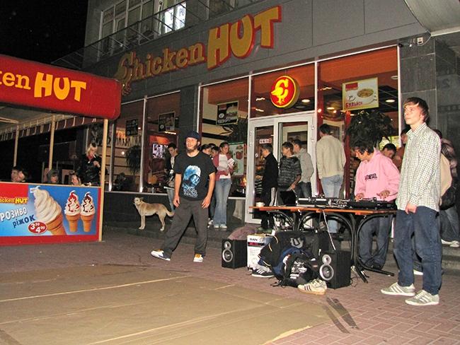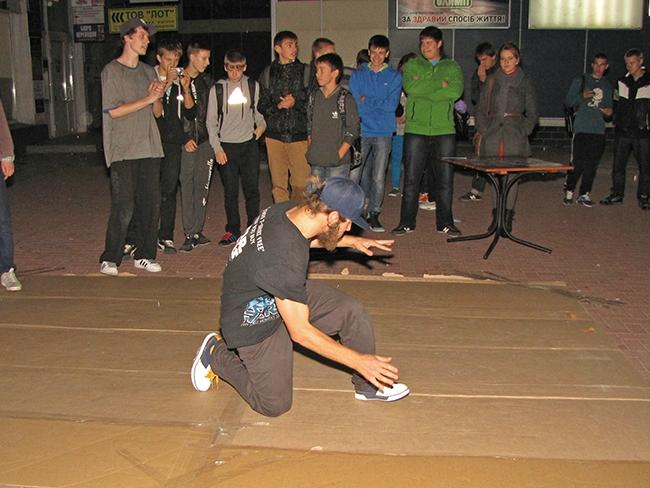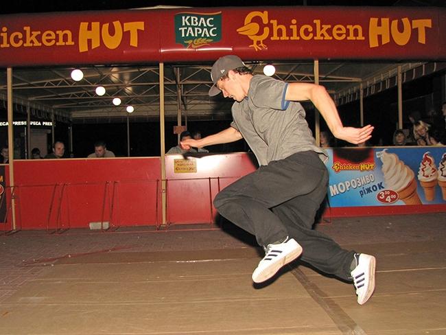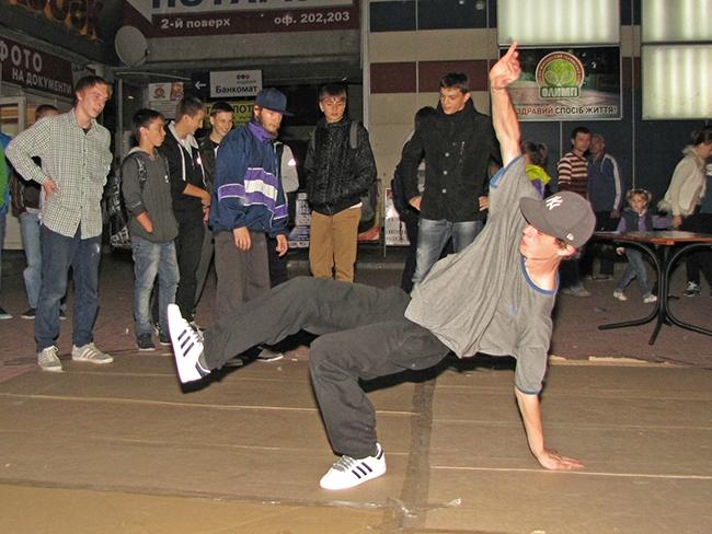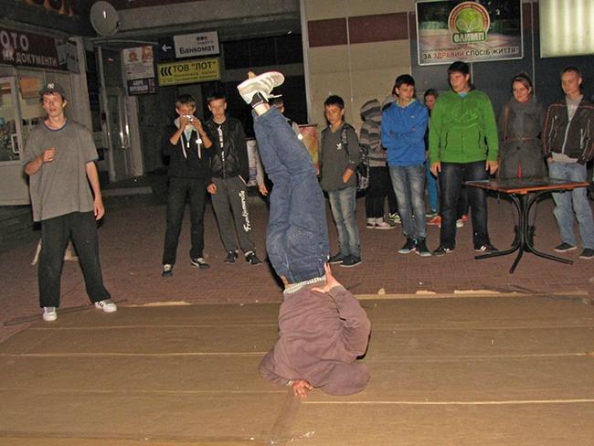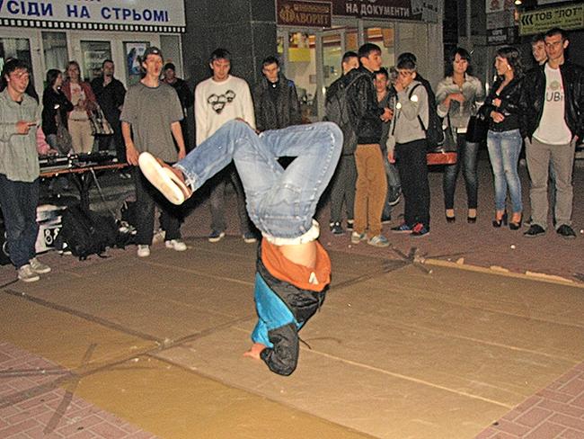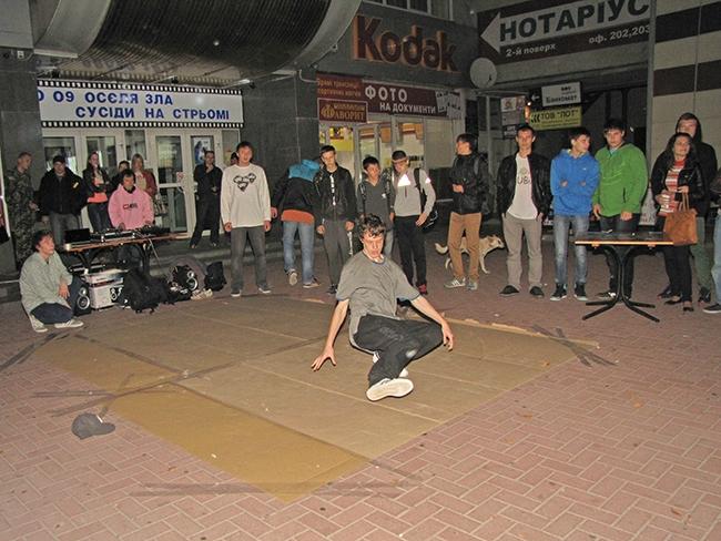 День города ребята из школы «Славь-Ян-Инь» (есть такая в Чернигове школа по Брейкингу, находится в школе № 13) отметили по Нью-Йоркски. Когда уже вечерело, они прикрепили скотчем к тротуарной плитке упаковочный картон, рядом с рестораном «Чикен Хат», и на такой импровизированной площадке устроили настоящее танцевальное шоу в ритме Хип-Хоп! Ребята демонстрировали свое умение в танце Брейк-данс (breakdance).