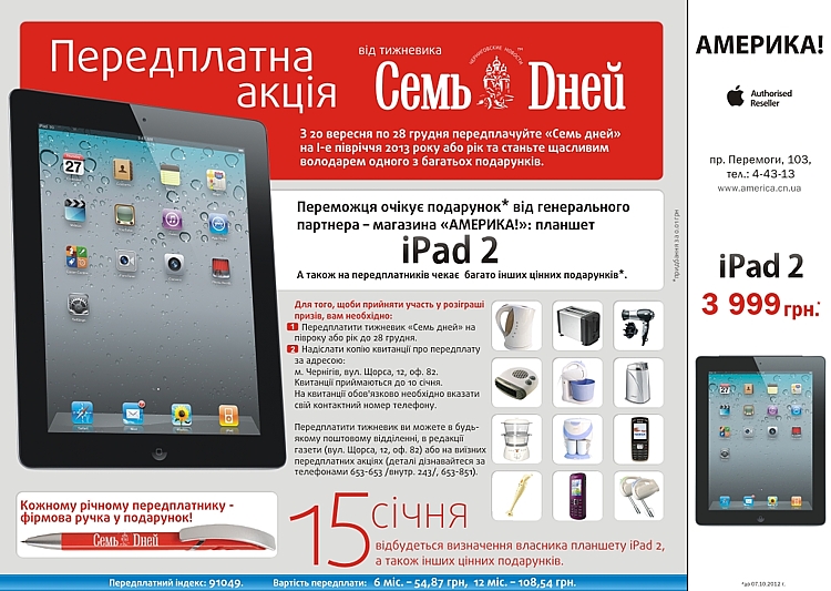 Что нужно сделать, чтобы претендовать на планшетный компьютер iPad 2 от Apple и многие другие ценные призы, мы попросили объяснить начальника отдела подписки Черниговской Медиа Группы Руслану Евдокименко.