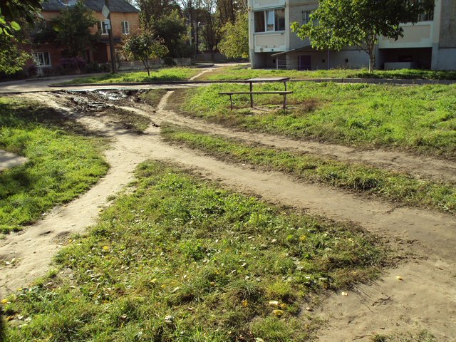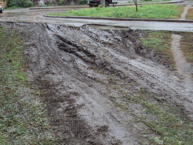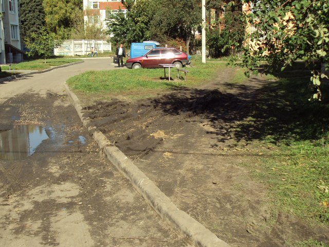 Травы уже не видно. Здесь же была травка, а сейчас грязь и лужи. Ездят все кому угодно. Сегодня, например, трактор черниговской ТЕЦ проезжал. А ведь здесь гуляют дети. К тому же большинство детей дошкольного возраста. У меня у самой ребенок. Я каждый день выхожу с ним на прогулку и, как мать, волнуюсь за своего ребенка. Сейчас еще день, детей достаточно мало. А вот вечером погулять выходят много ребятни.