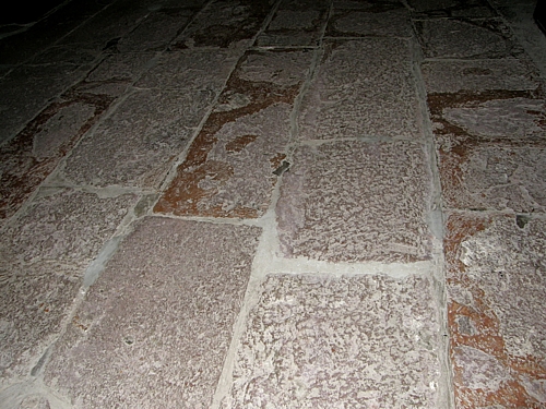 Как выяснили реставраторы, нешлифованные плиты были положены на слой песка, под которым была сделана заливка из битого кирпича и раствора. Древний пол лучше всего сохранился в центральной части храма. Плиты шифера здесь имеют толщину около 8 см., длина же их – от 1,5 до более 2-х метров.