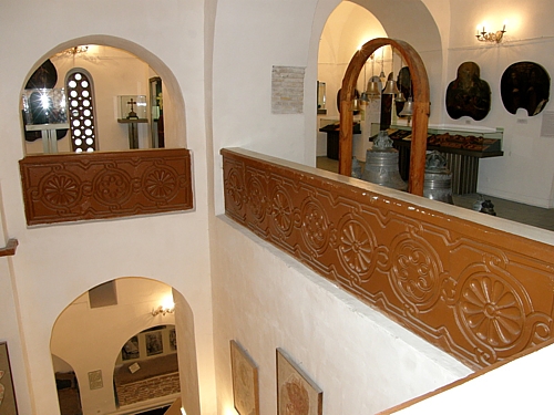 Кроме пола, шиферные плиты в соборе использовались также в качестве прокладок пояса карниза. Если же вы захотите подняться на хоры храма, то, идя по ступенькам, обратите внимание на перекрытия сводов – они также устроены из грубых плит малинового овручского сланца. Ну а в оформлении самой хоровой галереи древние зодчие использовали уже резные шиферные плиты. Оригинальные плиты, украшающие ограду хор Борисоглебского собора, к сожалению, не сохранились до нашего времени. Их место заняла послевоенная реконструкция плит, на которых вырезаны витиеватые орнаменты, вписанные в круги, напоминающие солярные знаки. Подобные рисунки встречаются на шиферных плитах хор из киевского Софийского собора. Плиты эти покрашены светло-коричневой краской и поэтому не передают первозданный розоватый колорит сланца, как и присущую самому камню шероховатость поверхности. Ну а как выглядели настоящие резные шиферные плиты изначально, можно представить по сохранившимся плитам хор Спасо-Преображенского собора, из 11 плит которого до наших дней дошло 6. Однако их каменные узоры имеют более культовый характер – в центре каждой такой плиты обязательно среди орнамента изображен крест.