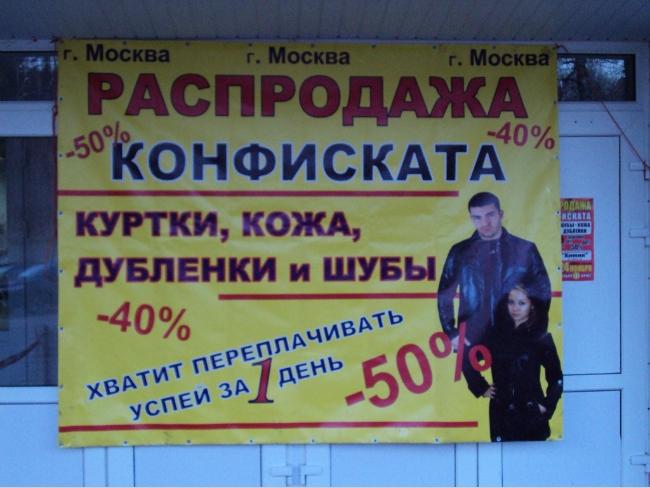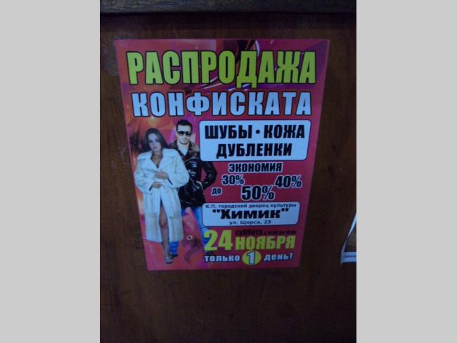 Прочитав афишу о том, что в городском Дворце культуры, в субботу 24 ноября пройдет однодневная распродажа кожаных изделий по бросовым ценам, отправился туда. Недалеко от дворца культуры ходил парень с громкоговорителем и активно завлекал людей в открывшийся однодневный бутик. Скидки обещал невероятные. Такую дешевизну объяснил тем, что данная продукция была конфискована у московских предпринимателей.