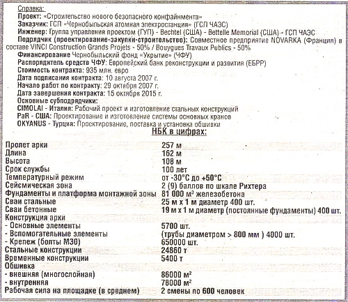 — Ну, конечно, обидно. Это непризнание профессионализма. Мы бы хотели, чтобы нам предложили... А кто бы не хотел, ? чтобы его продукция была в историческом объекте? Это и в рекламном плане хорошо, и почетно. Не знаю, можно ли сделать такую конструкцию полностью на нашем заводе. Документации я всей не видел. Но, думаю, частично это возможно. У меня был знакомый француз. Я про арочную идею знал, наверное, 8 лет назад. Но дальше в Европе велись переговоры. Нужно иметь информацию, контакты, владеть языком. К тому же, думаю, это политический вопрос. Деньги ведь дала Европа, — говорит директор ОАО «Черниговский завод металлоконструкций и металлооснастки» Владимир Евсеенко. — Мы стабильно работаем со строительными организациями, которые выполняют монтажные работы на обьекте Чернобыльская атомная станция, или закрытая зона.