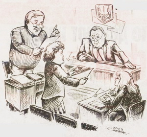 5 декабря. Заседание в Новозаводском суде Чернигова. Слева направо: адвокат Федор Зюзько, подсудимая Татьяна Юцевич, судья Алексей Подалюка и прокурор Наталья Гапеева / Рисунок Олега Синельника