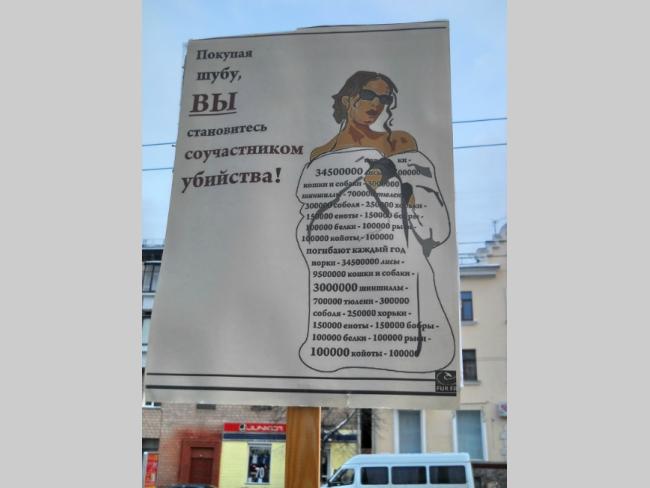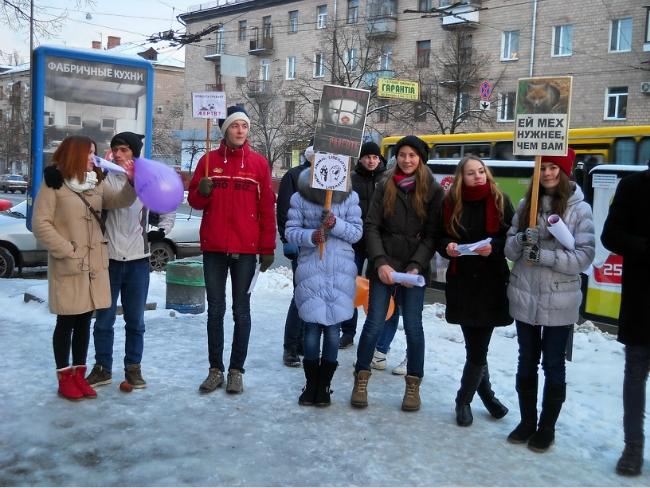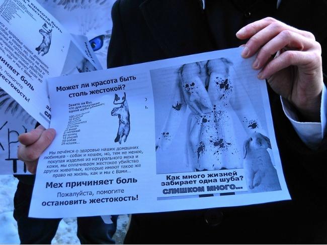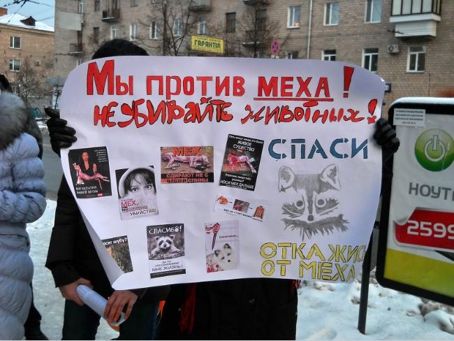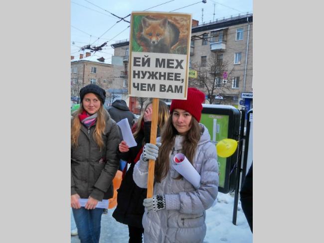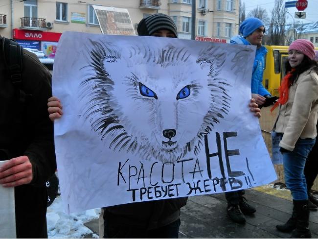 Главным лозунгом акции и одновременно речевкой стали слова: «Сами мы мехов не носим. Жизнь животных нам дороже!».