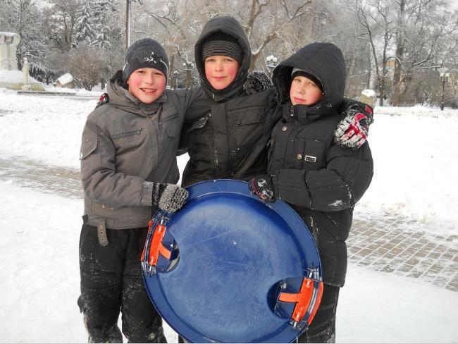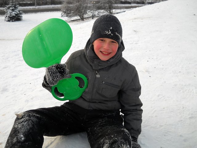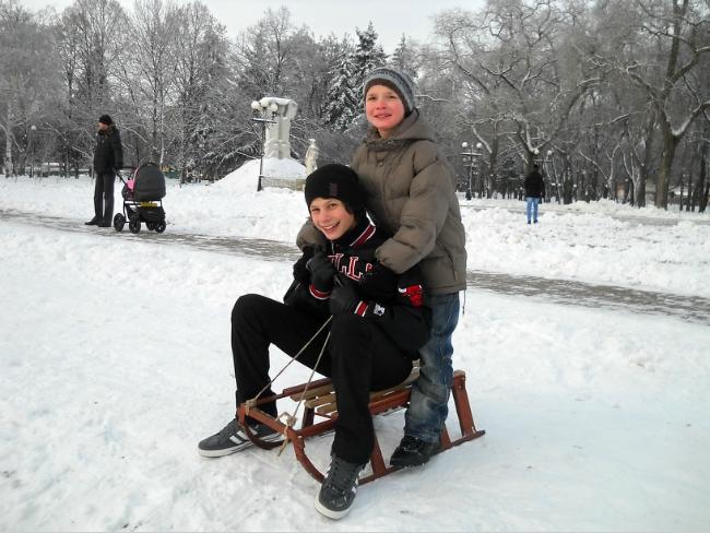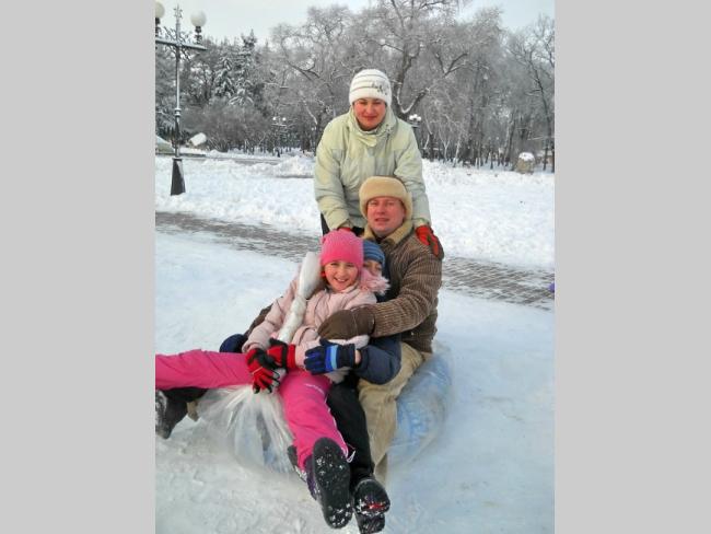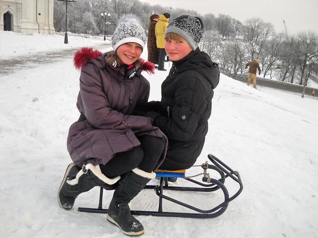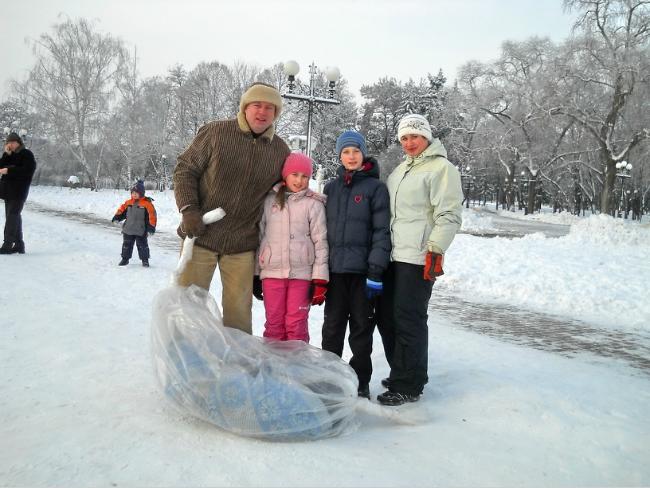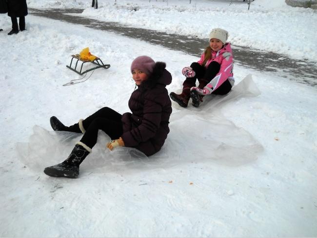 Мы просто гуляли и зашли на горку. Посмотрели на других, и самим захотелось прокатиться. Стоим и думаем, как это сделать. На горке бываем частенько. Ещё любим лыжи и коньки.
