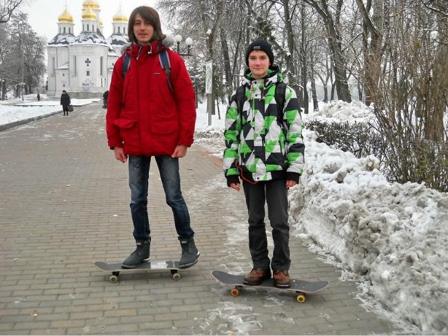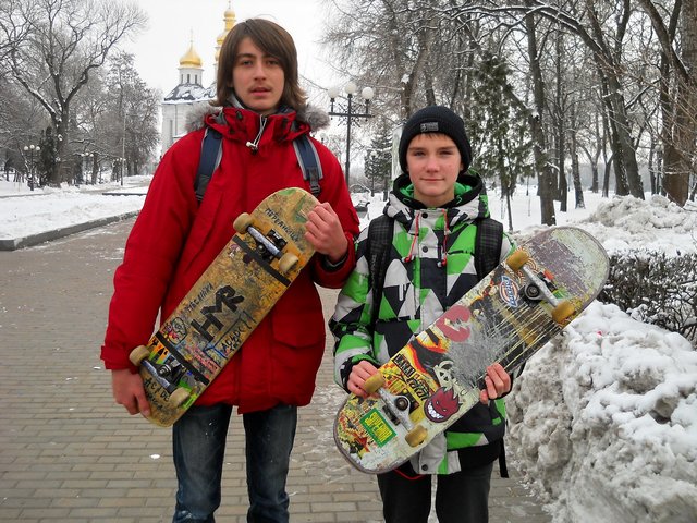Как оказалось, зимний  морозный день – совсем не повод отказываться и от летних развлечений. Уже уходя с горки, встретил двух мальчишек со скэйтами. Их «тренировочная база» – ступеньки Драмтеатра.