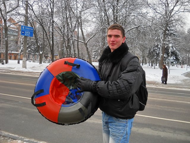 Иду развлекаться на горку. Эта штука называется «Сноутюб». Мы с другом купили таких два, и хотим попробовать  давать их на прокат. Подобные надувные круги используют  и летом – они буксируются катером.