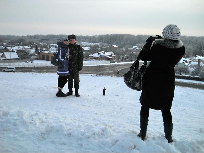 К 14-ти часам любителей лёгкого экстрима  на горке собралось   довольно много.  Перед соблазном получить порцию острых ощущений не устояли даже те, кто кататься и не собирался  - молодые парни, солидные женщины в длиннополых шубах и даже солдатики 8-го Учебного Центра, отпущенные в увольнение после вчерашнего принятия присяги.