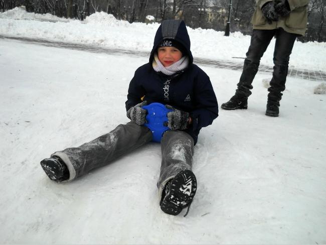 Мы здесь уже были вчера. Катаемся на пакетах, наполненных снегом. Кроме горки уже катаемся на коньках и лыжах.