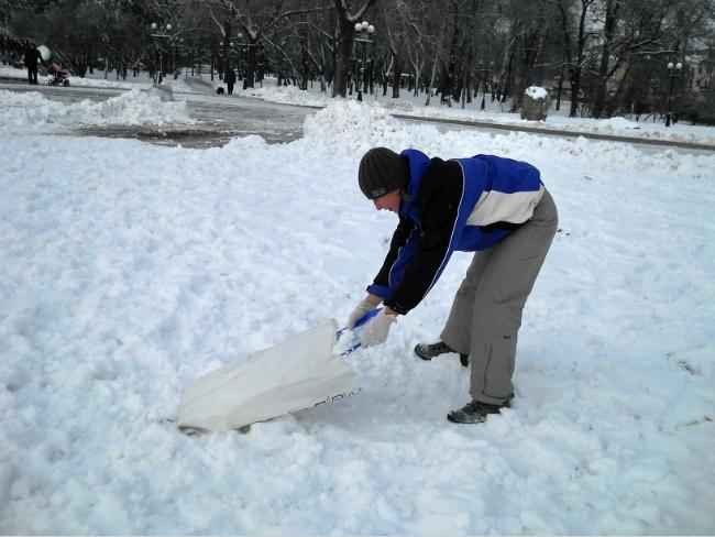 Кроме «агрегата» Сергея Аверченко обратил внимание и на ещё одно народное ноу-хау  – полиэтиленовый пакет, заполненный снегом.