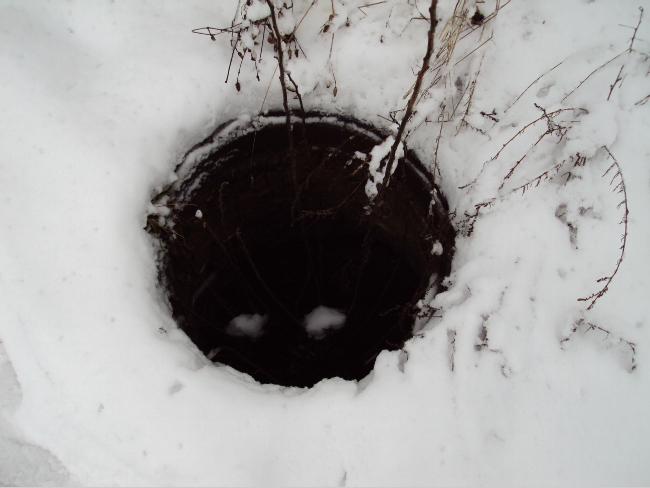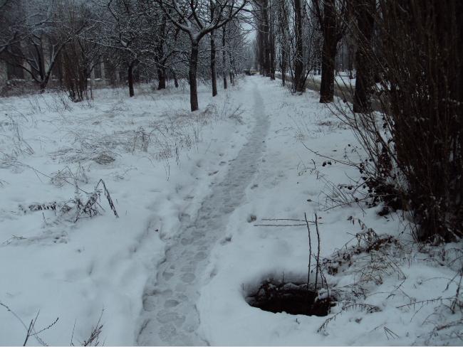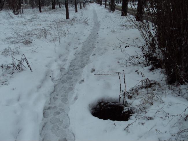Вот такую западню я заметил не далеко от «Химволокно», возле конечной автобусов №25 и 41. Судя по тропинке, протоптанной людьми, этой дорожкой пользуются многие. Пока тепло и снег тает эту шахту видно, но когда приморозит и начнется более сильный снегопад, то подобная не прикрытая шахта может сыграть с кем-то злую шутку.