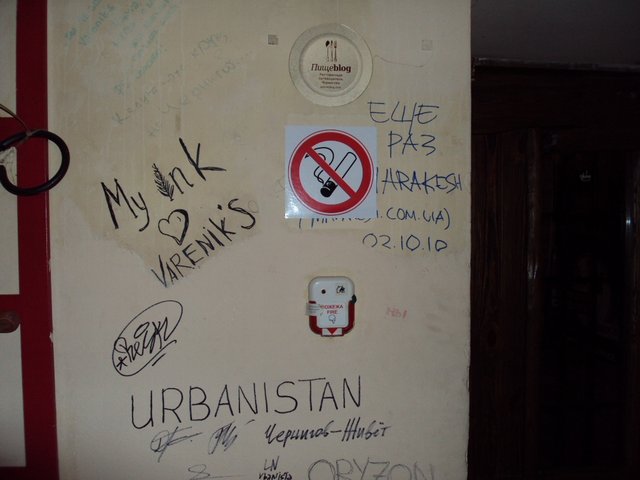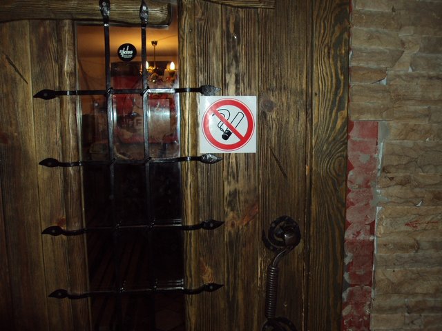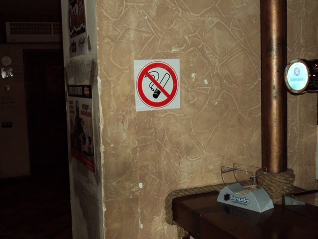 12:50. На пороге стоит молодой человек, курит. Внутри паба – всего лишь три посетителя. Сигаретного дыма не ощутил. Ни на одном столе нет пепельниц. Спросил у официантки Ксюши можно ли курить в заведении, на что получил отрицательный ответ. Таблички, запрещающие курение, были в обоих залах.