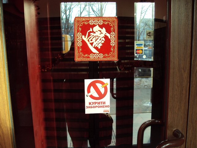 13:40. При входе на двери посетителя сразу же встречает китайский иероглиф и знак, уведомляющий о том, что в заведении курить запрещено. Пообщавшись с сотрудником ресторана Владимиром, узнал, что теперь в заведении не курят. Кальяны также не готовят. Два кальянщика, работавших в ресторане были уволены накануне.