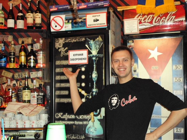 14:05. В заведении под названием «Куба» примерно та же ситуация, что и в предыдущих. Никто внутри не курит, пепельниц на столах нет, кальяны не готовят. В залах несколько наклеек о запрете курения.